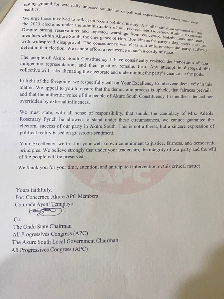 We must state, with all sense of responsibility, that should the candidacy of Mrs. Adeola Rosemary Fynch be allowed to stand under these circumstances, we cannot guarantee the electoral success of our party in Akure South. This is not a threat, but a sincere expression of political reality based on grassroots sentiment.