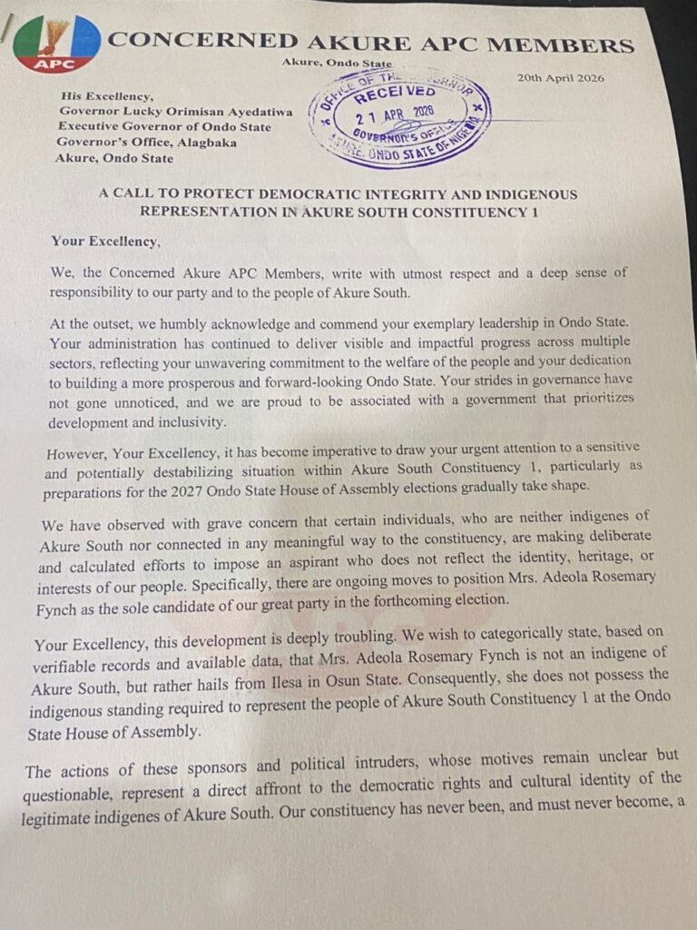 Dated April 20, 2026, the letter, signed by Concerned Akure APC Members—was addressed to Lucky Orimisan Ayedatiwa. But beyond its formal tone lies a deeply rooted concern that is anything but ordinary.